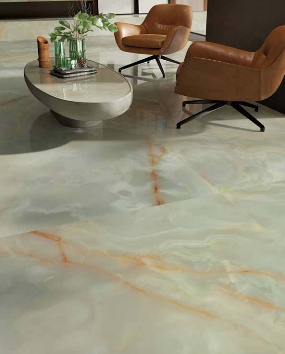 Это истинный гимн свету, превратившемуся в элемент архитектуры, который отражает и приумножает красоту. Такова душа GEMME, коллекции керамогранитных плит с имитацией драгоценных камней, излучающих неподвластное времени великолепие. Коллекция точно воспроизводит оникс по размеру, отделке и цвету, визуально освещая и увеличивая пространство.